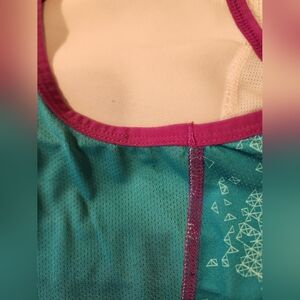 Teal and purple racerback The North Face women's tank top. Size small. Has built in bra. Used with a small mark on the back (see last pic) otherwise in great condition.