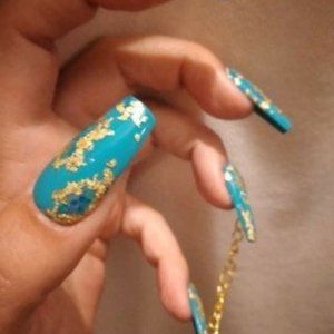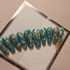 Teal green n gold geode moon n sun press on nails Can be used with sticky pads for short time wear. Or glue on for up to two week hold . For best results,