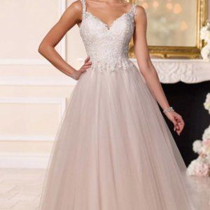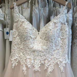 Tea-length, tulle skirt, fitted lace bodice, v-neckline