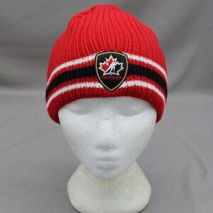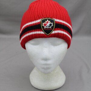 Up for sale is a team Canada toque/beanie. It has a red base colour with white and black stripes that wrap around the lower portion of the toque. The front of the toque has the Hockey Canada logo crested on with the Nike logo stitched in the back. What a great toque do not miss out on it.