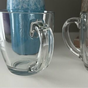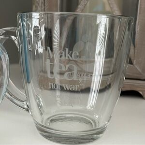 Clear glass with etched logo and quotes. Opened and stored. Never used.