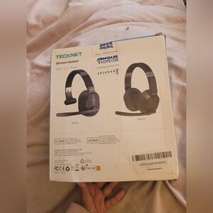 TeckNet wireless headset with black design. Includes USB adapter and charging dock.