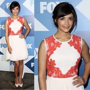 - As seen on Hannah Simone in a cream & red color way on the red carpet (see last photo)
