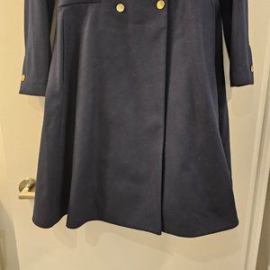 Beautiful, Stylish navy blue wool coat with classic Ted Baker floral inner lining details adorned with gold coloured buttons and flared skirt.