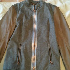 Ted Baker Beyty Grey blazer jacket zip up with tan brown leather sleeves size 1 like new no tags