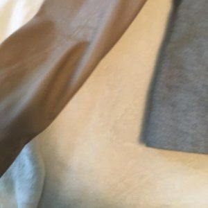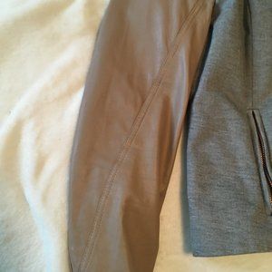 beyond beautiful and classy you will love this piece! its a grey body with leather sleeves, unique design yet practical for everyday use and can easily be paired with jeans, skirts or trousers for a wear to work and transition to a fun night out!