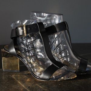 BlackT-strap Sandals with Gold Block Heel by Ted Baker. Never worn. Protective plastic still intact. Size 37 Euro.