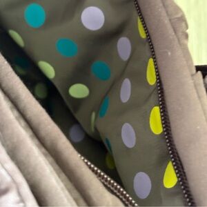 Fun and funky Ted Baker tote in a bold floral print with contrast polka dot interior. Features a satin-like nylon body, double handles, drawstring detail with logo charm, and triple zippered compartments. Lined interior with signature colorful dots and attached mirror.