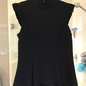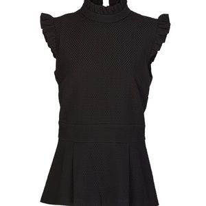 Gorgeous structured top featuring a high neck ruffle design with ruffles at the sleeves and has a peplum waist.