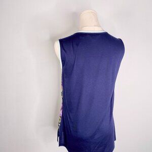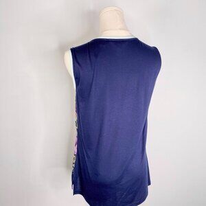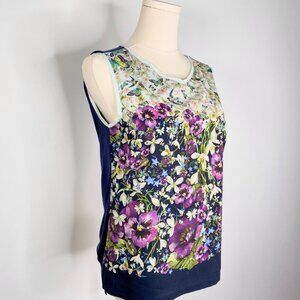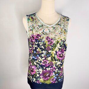 ⋆ Charming Ted Baker Floral Garden Shirt, adorned with a vibrant print of peonies, jasmine flowers, butterflies, and sparrow birds. The design features a stunning array of hues, including purple, dark navy blue, white crème, green, and pastel pink, creating a garden-inspired masterpiece. With a flattering V-neckline and a solid dark blue back, this shirt combines whimsical floral details with a sophisticated touch, making it a perfect choice for adding a burst of color and elegance to your wardrobe.