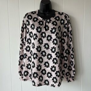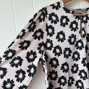 Ted Baker light pink floral blouse with a keyhole neckline. Long sleeves with gathered cuffs. Hook and eye clasp at neckline