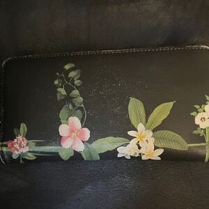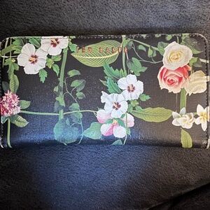 Elegant Ted Baker wallet with a floral design. Features pink and white flowers and green leaves on a black background. Good used condition