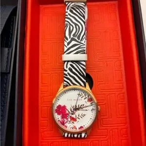 Elegant Ted Baker watch featuring a floral dial and zebra print strap. Rose gold accents add a touch of luxury.