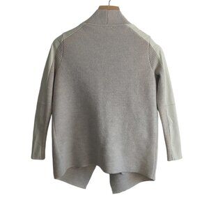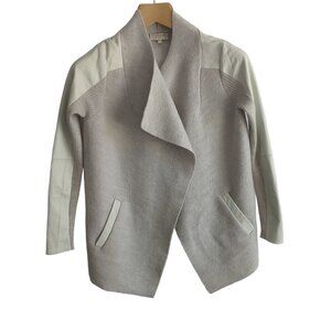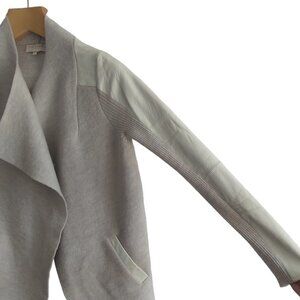 This is a light heather grey boiled wool open front jacket by Ted Baker London. Ribbed knit sleeves with white leather panels.