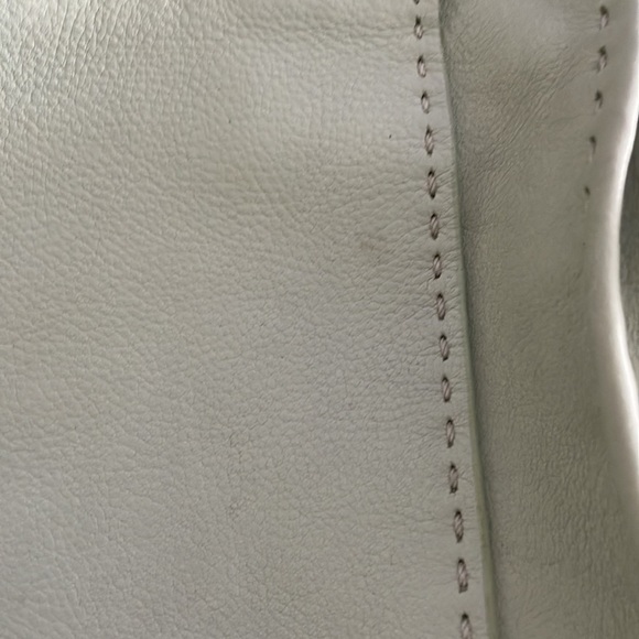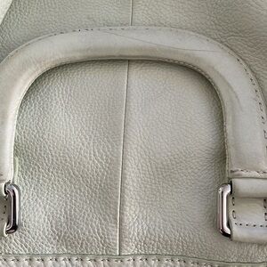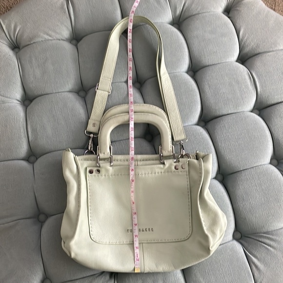 Ted baker hickory stab Stitch leather bag in mint green with silver hardware. Zipper closure, Two small handles and one large removable/adjustable strap. Raw leather interior and satin patterned interior pocket. Good used condition! There is wear to the handles, and a few small marks on the exterior of the bag, very light pen marks on bottom left corner, some wear to the bottom corners, marks and pen marks on interior. Please keep in mind the colour is a very light green and doesn’t show well in the photos Please see photos, reasonable offers welcome!