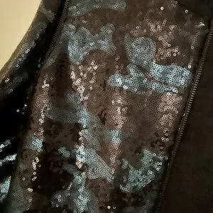 Ted Baker camo print sequin jacket. Collarless with a shoulder zip detail. Exposed zip fastening.