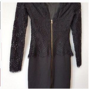 Beautiful black lace dress worn once. Eyelash-edge crochet lace overlays the bodice & fashions long, sheer sleeves of an elegant stretch sheath that dips to a low back. Lace overlay. Long sleeves. Back deep with a V neckline. Exposed gold back-zip closure. Fully lined.