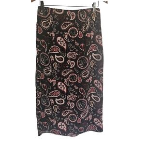 Elegant midi skirt with paisley pattern. Features black and pink colors. Perfect for any occasion.