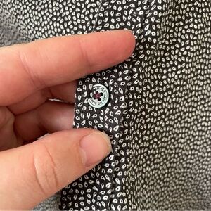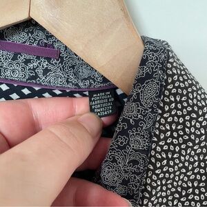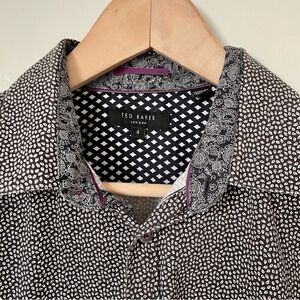 Ted Baker London Cotton Button Down Dress Shirt Black and White Printed Size Large. Ted Baker size 4 which is equivalent to a Men's Large per the website. Authentic Pearl shell buttons, one of them is chipped but has an extra button on tag if you wanted to replace. Still functional as is. 100% cotton, made in Portugal. Collared button down shirt. Perfect dress shirt for under suit, or just for the office. Size large. Excellent condition other than the button.