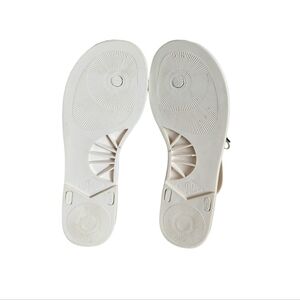 Elegant cream sandals. Features gold bow detail. Perfect for summer.
