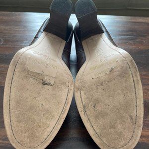 Gorgeous plum leather with a wooden, leather wrapped heel and leather insole, and the suede and embroidery applique on the toe box is beautiful. These are from about 2009 I believe, though I've had a hard time finding the name. I bought them in a high-end consignment store in Portland Oregon in 2010, before the first Ted Baker US store opened so they must have been purchased in London. I love love love them, have worn them a handful of times but can't wear heels anymore. A solid and very well made shoe. Rare, and a real find.
