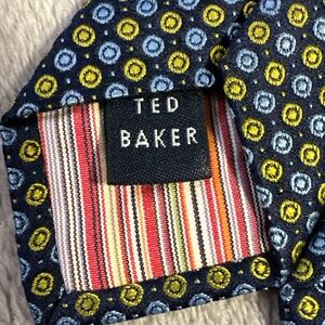 Ted Baker London Men's Necktie Navy Blue Yellow Dots Circles Silk Made in USA
