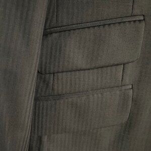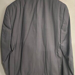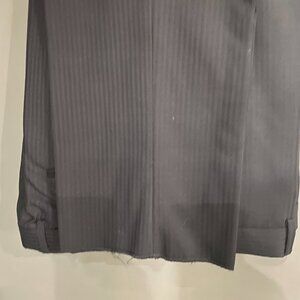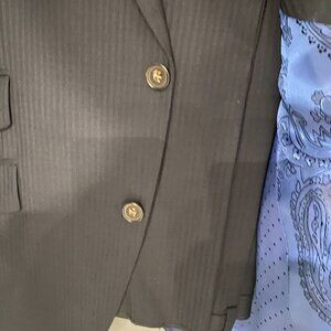 Tags still attached, never worn, never altered. 100% wool, dark blue with a mild stripe pattern - very classy formal wear. 2 Button jacket, Classic Ted Baker double pocket coat on the right side. Unaltered pants are sized 33R. This suit is in brand new condition - no smells, no stains, no issues.