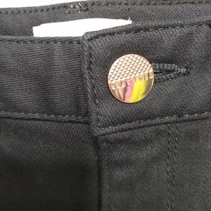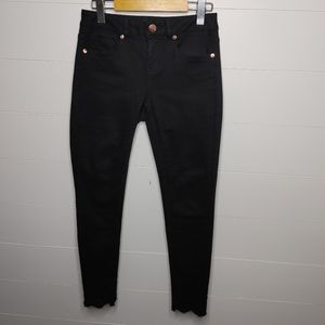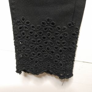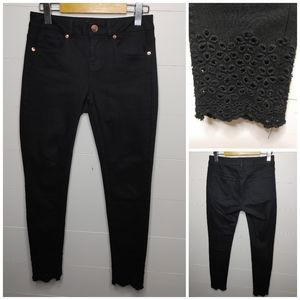 Beautiful true black stretch jeans with embroidered eyelet hem. In excellent condition. b111