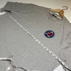 Bringing stylish looks to your wardrobe that don’t take themselves too seriously, this t-shirt sports a graphic patch on the chest. The best bit? It’s removable. Doesn’t that sound fun? Also, sporting a classic stripe and higher, round-neck collar, this is a t-shirt that brings fun and fashion together in perfect harmony.