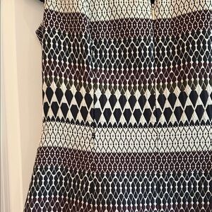Step out in style with this elegant patterned dress. Perfect for any occasion, this dress offers a chic and timeless look. Navy, cream, burgundy with gold.