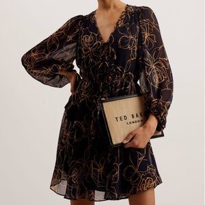 Ted Baker V Neck Printed Tie Front Mini Dress Navy - Size 1