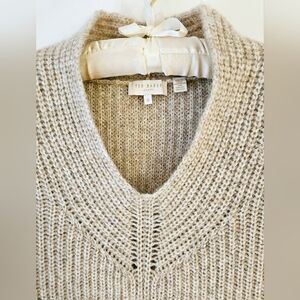 This is a very soft and light-weight, tan/oatmeal or light beige, neutral knit, v neck, long sleeve, alpaca blend sweater from Ted Baker.