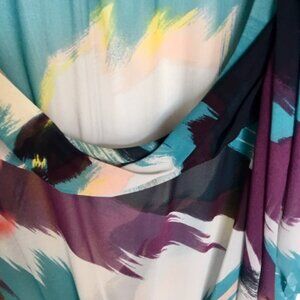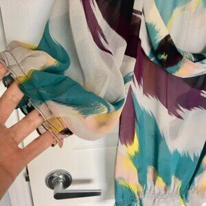 This is such a BEAUTIFUL blouse! Its a size 0 in Ted Baker which converts to a xs or 0/2 (may fit up to a 4 or small depending upon your meas.) It is 100% silk and so gorgeous! You need to see and feel it! Its sheer but the water color print gives enough coverage. It has beautiful detail on the scoop neck, the sleeves have details and check out the elastic waistband which allows you to wear outside your clothing or tuck in. It is such a delicate, feminine and light blouse! The colors will look amazing on all skin colors.
