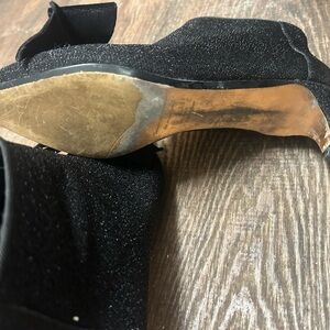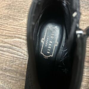 Ted Baker size 37 EUR “Bowtee” Lurex very very good condition- very minor wear please see pics and measurements! These are so cute- brass/metallic bottom with little award. These ankle booties in black exude elegance with their sleek pointed toe and charming bow detail. The kitten heel adds a touch of sophistication, making them ideal for dressy occasions. A side zipper ensures easy wear and a snug fit.