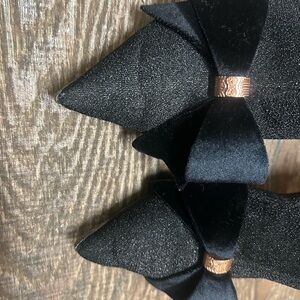 Ted Baker size 37 EUC/GUC “Bowtee” Lurex bow Black Ankle Boots with Kitten Heel