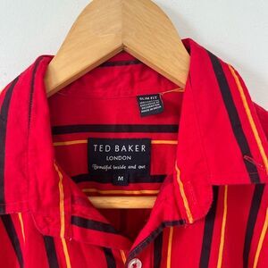 Ted Baker, red stripe shirt, slim fit dress shirt, cotton button down, men’s dress shirt, tailored fit, classic button-up, striped shirt, formalwear, smart casual, modern professional, office attire, business casual, luxury menswear, sophisticated look, long sleeve shirt, designer shirt, crisp cotton, refined style, upscale brand, boutique menswear, sharp silhouette, clean lines, versatile shirt, timeless piece, elevated basics, sleek style, confident dresser, polished and professional, stylish businessman, modern gentleman, fashion-conscious man, someone who values fit and detail.