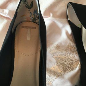 beautiful black bow with a gold plated ted baker detailing in the middle of the bow, and gold plated colour feature edge of toe area ---super classy!