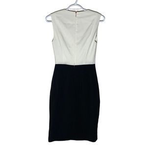 Crisp black-and-white blocking enhances the polished aplomb of a sleeveless V-neck dress that gives the impression of double-breasted styling thanks to clever seaming and button details. A vent at the front hem completes the illusion.
