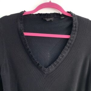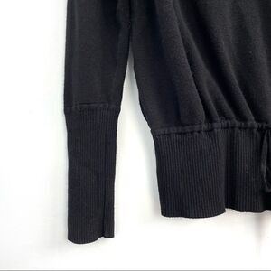 Black long sleeve v-neck sweater with drawstring detail at hem and ruffle detail at v neck .