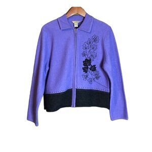 Keywords: Teddi Petite boiled wool sweater, 100% wool zip up, boiled wool jacket, embroidered wool sweater, cozy wool cardigan, petite boiled wool top, wool zip sweater, warm winter layer