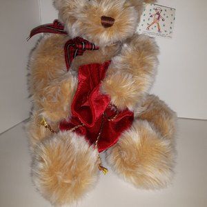 Beautiful teddy bear from Gund, he is holding a red velvet sack perfect for hiding a small gift, trinket, or ring. Excellent condition.