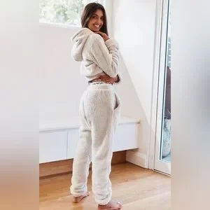 The hoodie is not the cropped version but the regular length. The hoodie is a size small. The pants are size xs. Worn once. Very cute but not my style. Open to reasonable offers offers