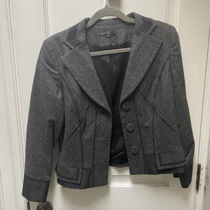 9/10 Condition, Rarely worn. Excellent condition, with no stains or marks. This piece features a short-cropped blazer with a pepper finish, detailing a black and dark grey color