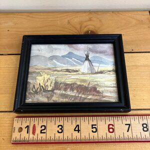 Framed postcard has original watercolor painting of a traditional teepee in a wilderness landscape scene. Postcard has handwritten message & postmark on back. Artist's initials "A.S.F." are signed to the bottom right corner. Frame size is 5 1/2" x 7". Pre-owned condition: wooden frame has a few scratches/chips/indents to black painted surface.