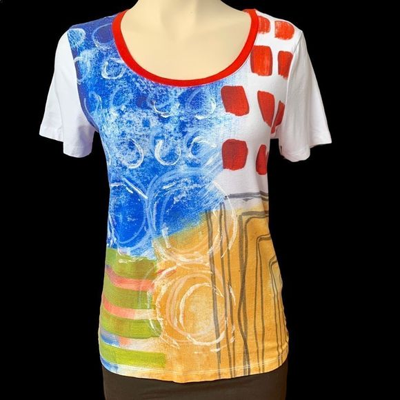 Woman’s tee no name or size it was removed. Has red blue and gold colours in circles squares and lines