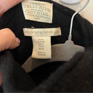 Timeless and cozy, this classic black turtleneck sweater by Telluride Clothing Company is crafted from 100% extrafine merino wool for ultra-soft warmth. Features a relaxed fit, ribbed hem and cuffs, and minimalist styling—perfect for layering or wearing solo. Tag size Medium. Made in Cambodia.