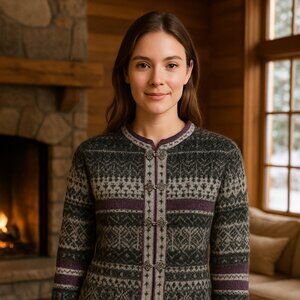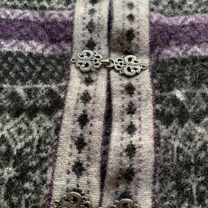 Beautiful Telluride Clothing Co. wool cardigan sweater featuring a traditional Fair Isle inspired pattern in shades of purple, gray, and black. Made of 100% wool, this piece is warm, cozy, and detailed with ornate silver-tone hook-and-eye closures down the front for a Nordic-inspired look.