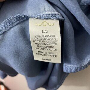 Excellent condition. No flaws. Beautiful color and design. Flutter sleeve. Flattering loose fit. 100% rayon. Machine washable.