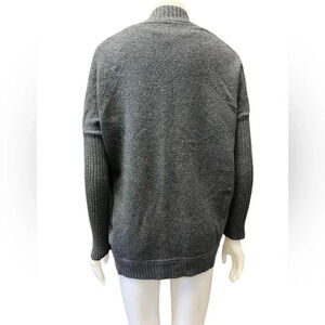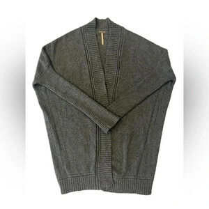 Temperance charcoal knit cardigan, ribbed hem and sleeves. Call out on bottom right, woven detail on side front. Little to no stretch.