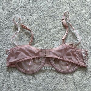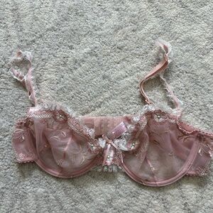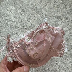 Charming pink lace bra with floral embroidery. Delicate and stylish design. Ideal for adding elegance to your collection.
